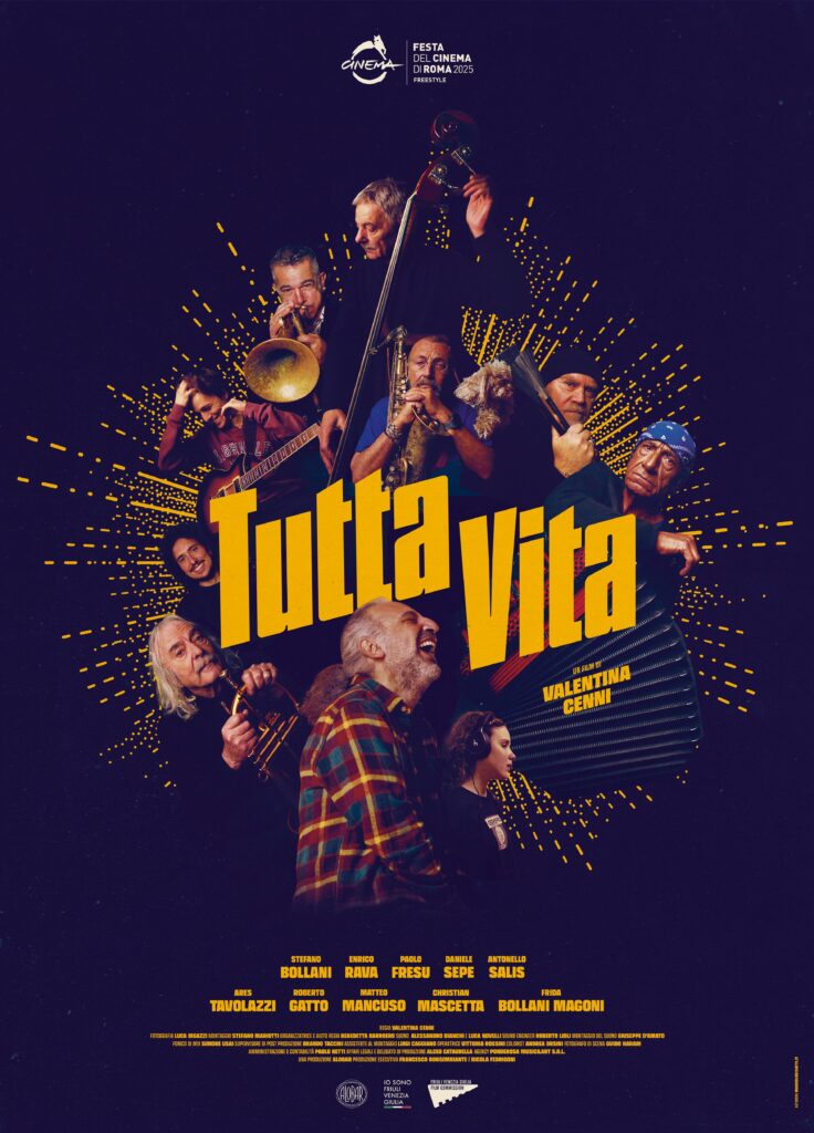 Tutta vita racconta infatti la straordinaria avventura di un ensemble composto da alcuni dei più grandi musicisti jazz italiani — Enrico Rava, Paolo Fresu, Daniele Sepe, Antonello Salis, Ares Tavolazzi, Roberto Gatto — affiancati da tre talenti emergenti: i chitarristi Matteo Mancuso e Christian Mascetta, e la cantante e pianista Frida Bollani Magoni. Riuniti per una settimana in una casa-studio, questi artisti danno vita a un laboratorio creativo intenso e spontaneo, culminato in un concerto unico al Teatro Rossetti di Trieste il 17 febbraio 2025.